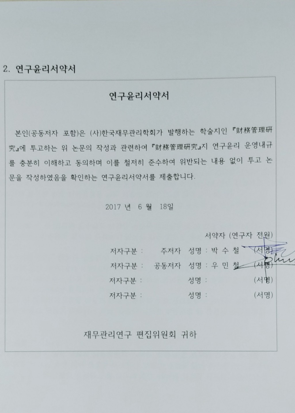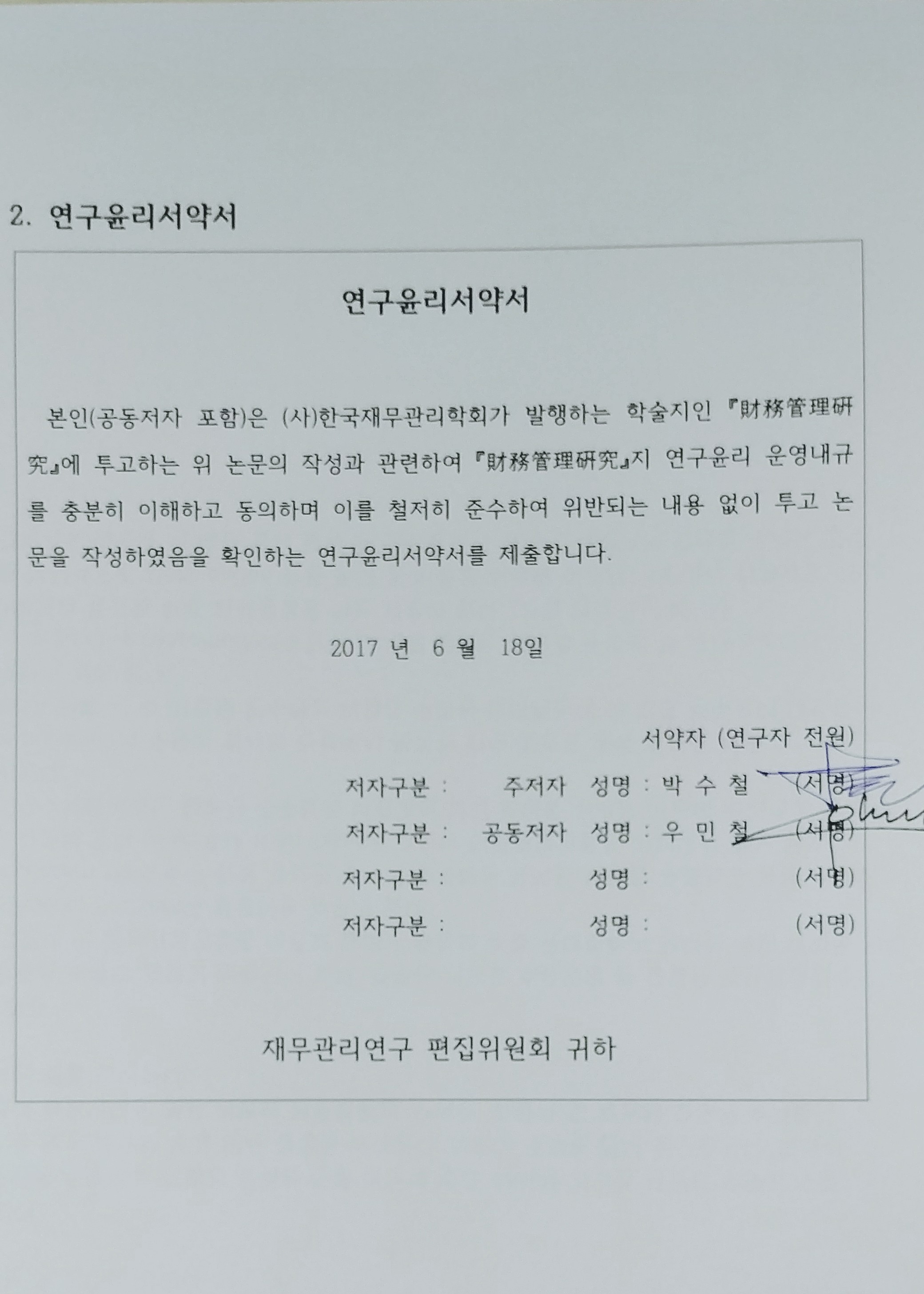 연구윤리서약서는 사인을 담은 사진을 화일로 첨부하였고,