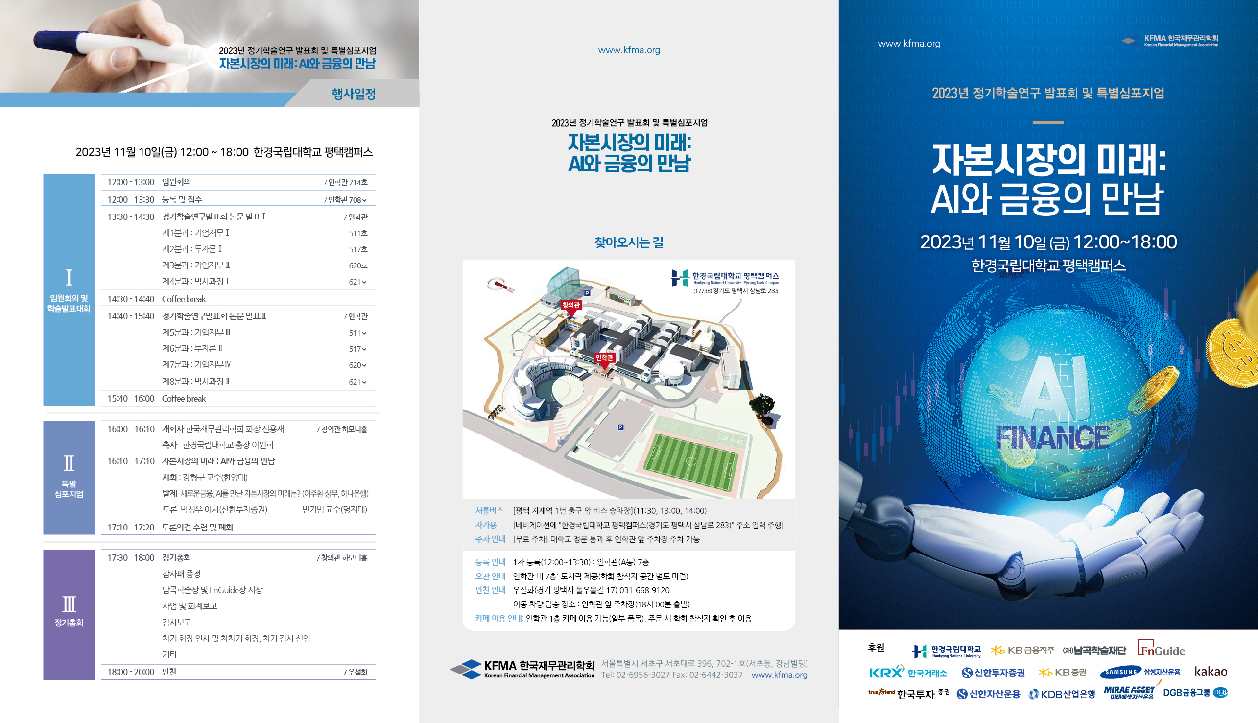이번 추계학술발표회의 일반 논문 발표 세션에 이어 열리는 특별 심포지엄에서는 ‘자본시장의 미래: AI와 금융의 만남“이라는 주제 발표와 패널토론이 진행됩니다. 금융산업 발전을 위해 동분서주하고 계신 가운데에서도 특별 심포지엄 발표를 흔쾌히 수락해 주신 하나은행 이주환 상무님께 대단히 감사드립니다. 그리고 패널토론을 위해 귀한 시간을 내어 주신 사회자 및 토론자 여러분께도 깊은 감사를 표합니다.